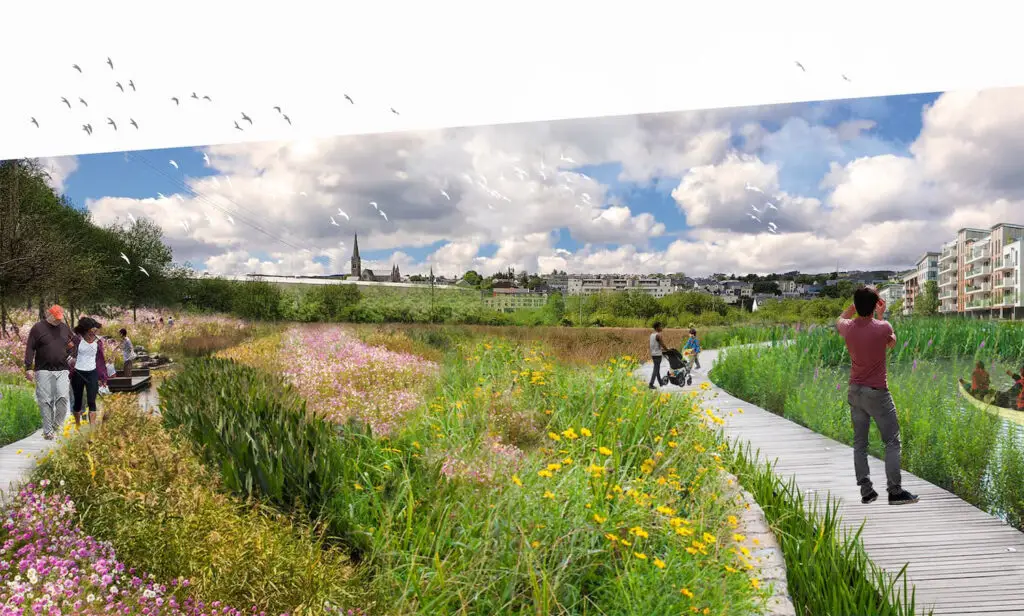 Letterkenny has been identified as highly vulnerable to climate change requiring a bold approach to both mitigation and adaption. A flagship proposal of the plan is a major new urban wetland located in the heart of the town. This will embed long term climate resilience into town centre infrastructure, by protecting surrounding built form and creating an enhanced wildlife habitat, while providing major new public space and stimulating development potential.